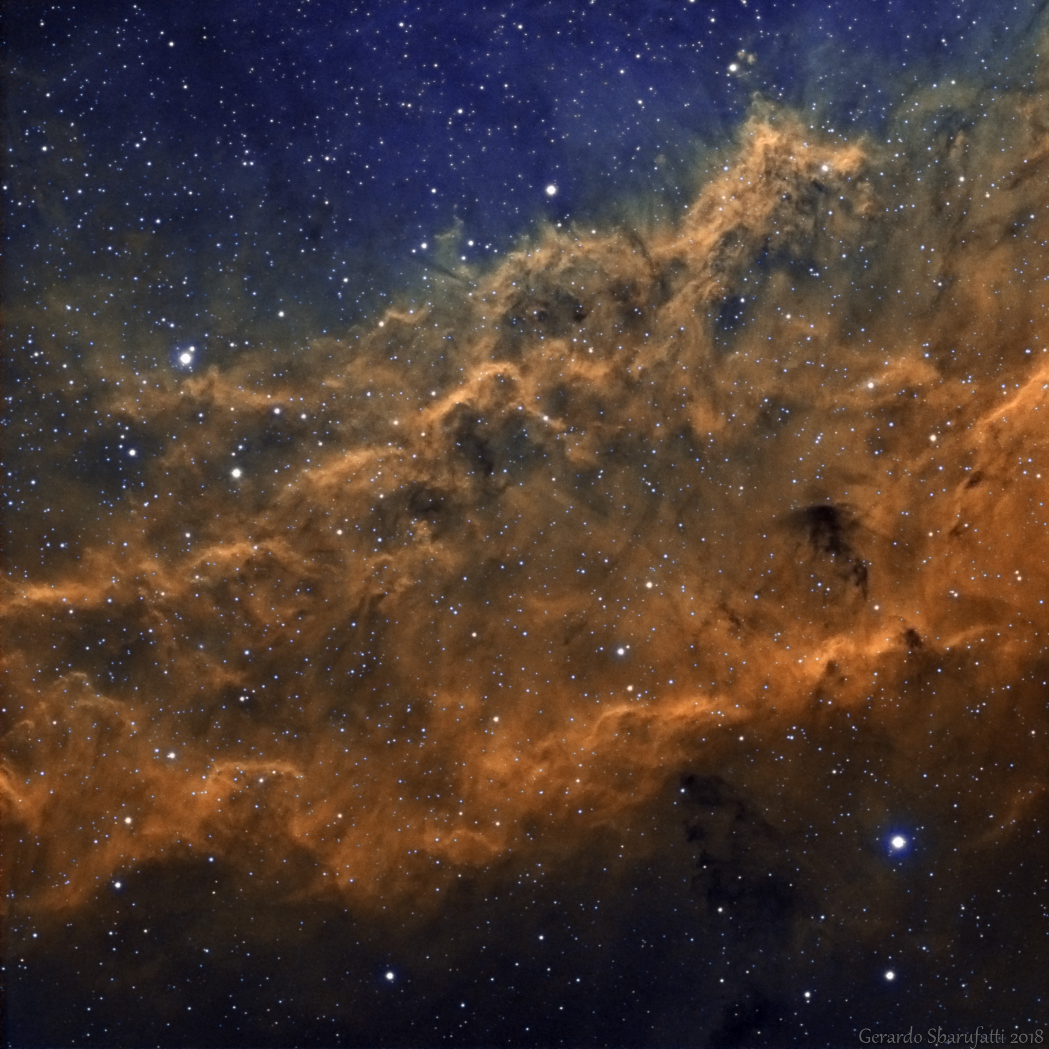 Parte centrale della grande nebulosa nel Perseo chiamata California e catalogata come NGC1499. La ripresa in SHO è quella che meglio rappresenta quella nuvola fumosa di gas di idrogeno, zolfo ed ossigeno che sembra l’evolversi di un cumulonembo