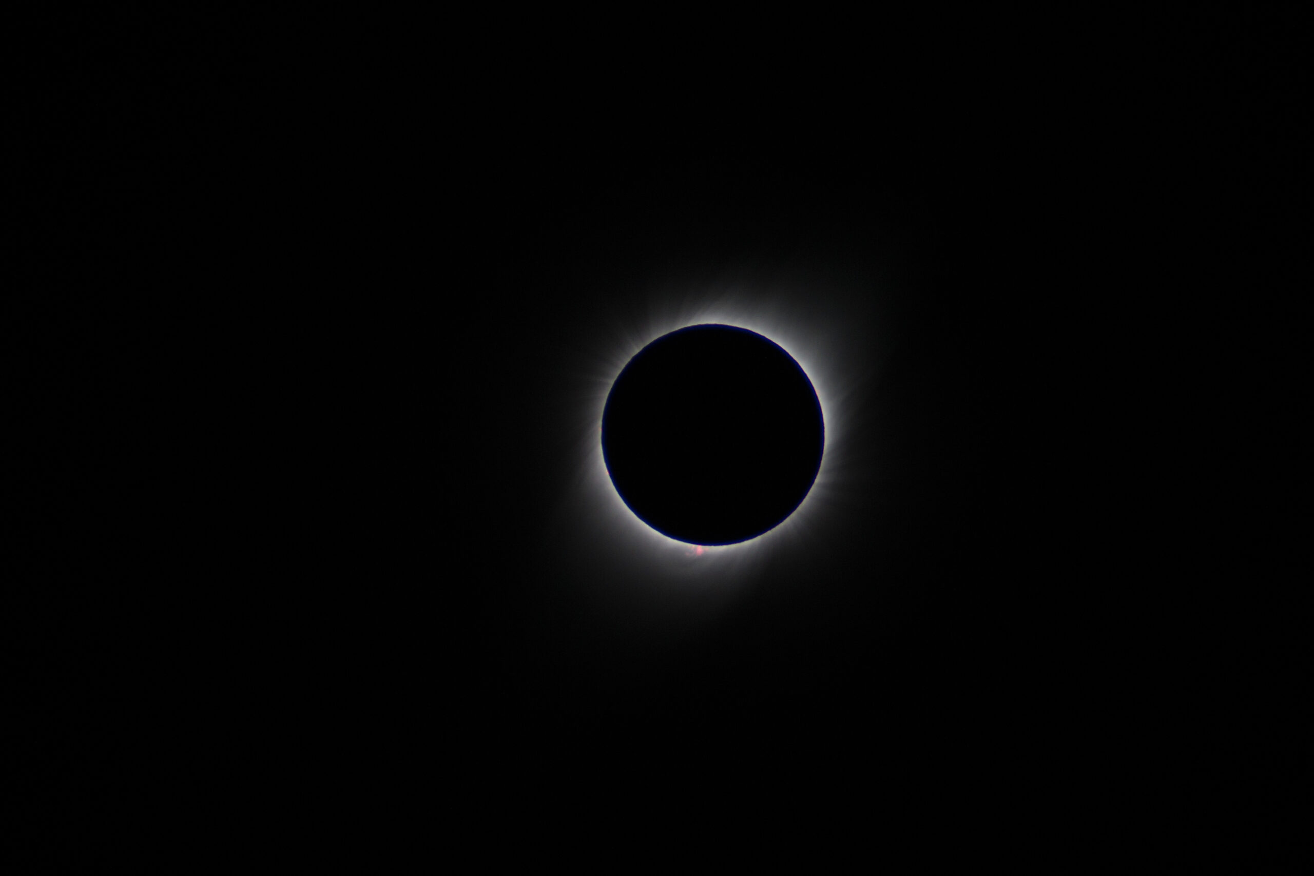 Nonostante l’attività solare al minimo (nessuna macchia visibile), si vedono alcune protuberanze. Meteo ideale, eclissi spettacolare.