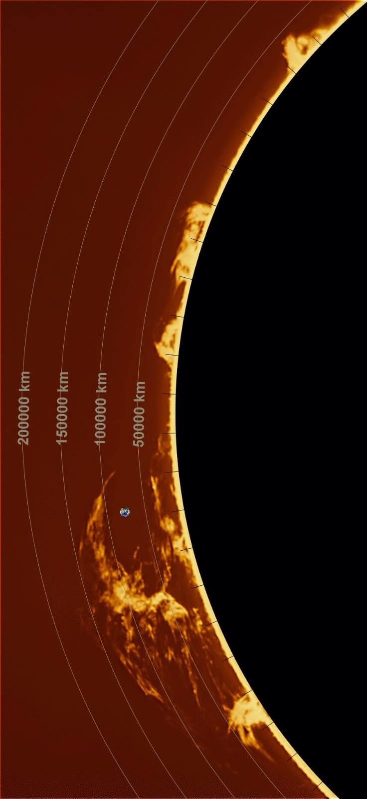 Lo scorso 9 novembre ho avuto la fortuna di osservare questa enorme protuberanza sul Sole. Per l’acquisizione ho usato un lunt 60 con bf1200 in configurazione double stack abbinato ad una player one apollo mini e barlow 3x. È stata una delle più grandi di questo ciclo. Dopo l’elaborazione con autostakkert, imppg e photoshop ho usato lusol3d per creare l’effetto coronografo, inserire i dati km e la terra in scala.