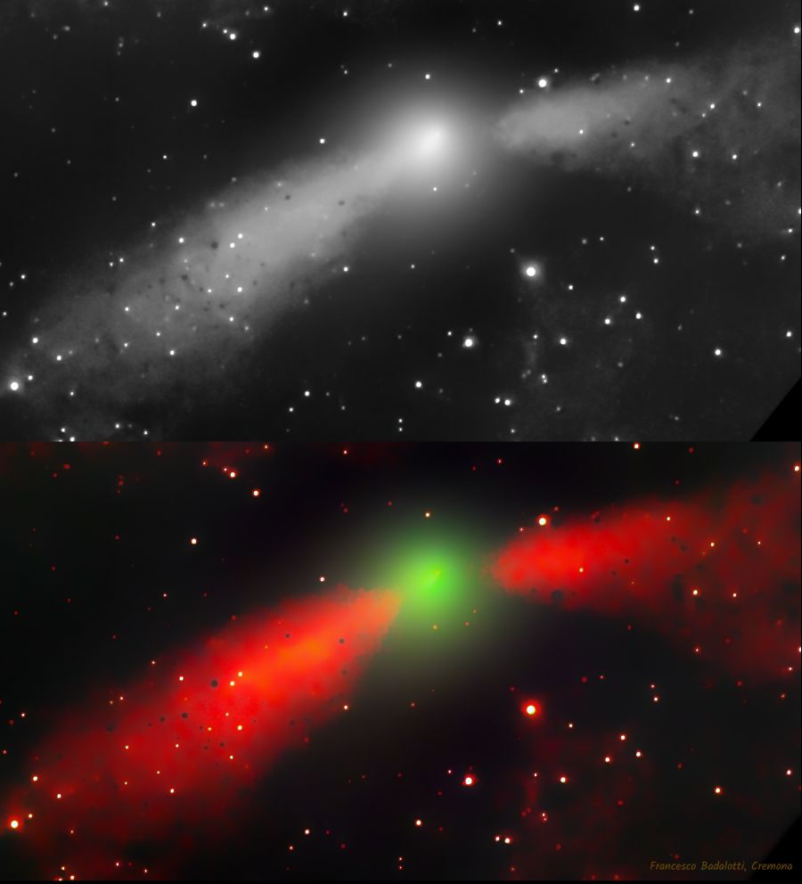 La cometa 12P/Pons-Brooks ripresa in data 26/05/2024 dal Cile con telescopio a controllo remoto PW-CDK 432mm F6,8. Mentre nelle immagini del 9 Maggio la seconda coda si rese visibile solo con l’elaborazione col filtro Larson-Sekanina, ora risulta ben visibile anche nelle immagini grezze. La foto pubblicata è il risultato della fusione fra la consueta elaborazione e dopo l’applicazione del citato filtro Larson-Sekanina. La colorazione rossa è la conseguenza di tale filtro, mentre il verde corrisponde alla chioma della cometa 12P/Pons-Brooks. Sopra è stata inserita anche un’immagine monocromatica dopo fusione.