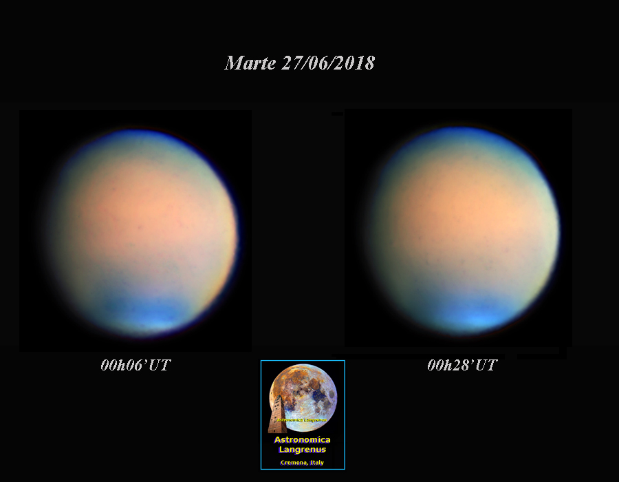 A differenza della notte del 21 Giugno in cui erano in netta evidenza numerosi dettagli sulla superficie di Marte, nelle immagini acquisite questa notte 27-06-2018 alle 00h06’UT e 00h28’UT la situazione sembrerebbe tornata simile alle nottate precedenti quando la vastissima tempesta di sabbia rendeva difficoltoso anche solo mettere a fuoco le immagini. In ogni caso anche questi sono dettagli interessanti dell’opposizione di Marte 2018. La turbolenza atmosferica è sempre stata ben presente anche durante le recenti acquisizioni video, mentre una fuocheggiatura accurata (per quanto possibile….) non ha consentito di evidenziare ulteriori dettagli. Telescopio Mak Rumak 255 f20 + Barlow 2x (f40, 10.000 mm) + I.S. DBK41 raw color, no filtri