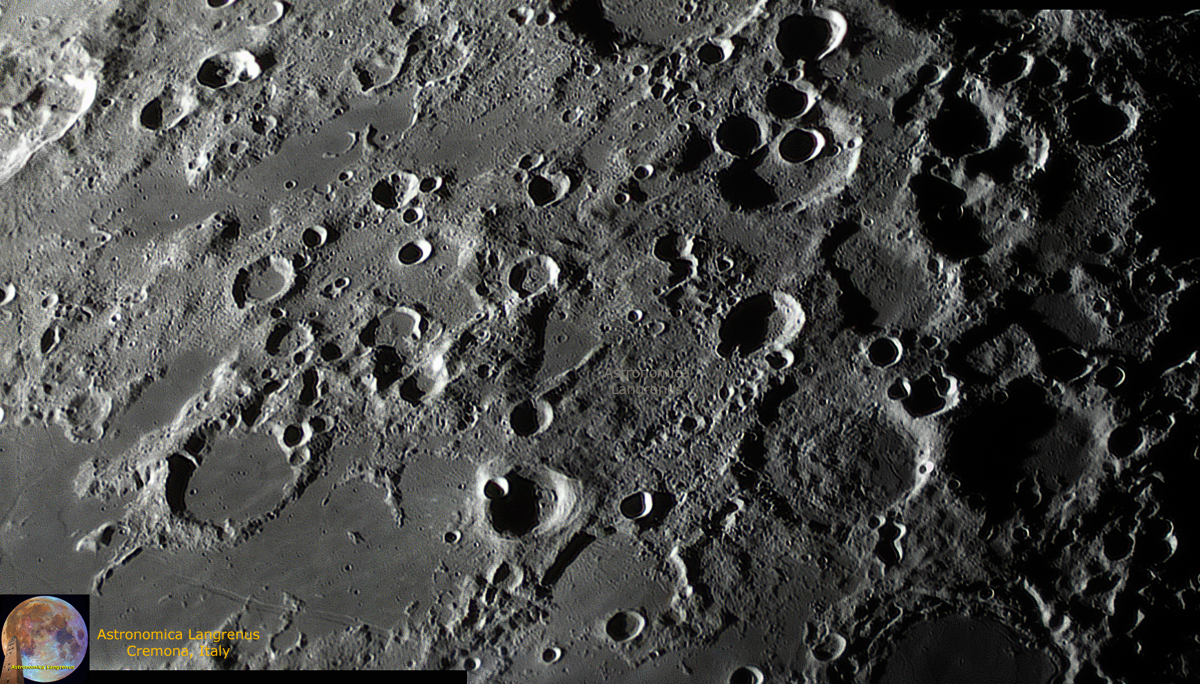 Regione lunare a sud del mare Nubium con parziale veduta sulla Palus Putredinis. Telescopio Maksutov Rumak 255mm F20 + filtro IR Blocking + Zwo ASI 224MC. Media di 1000/4200 frames totali a 30 fps in USB 2.0.