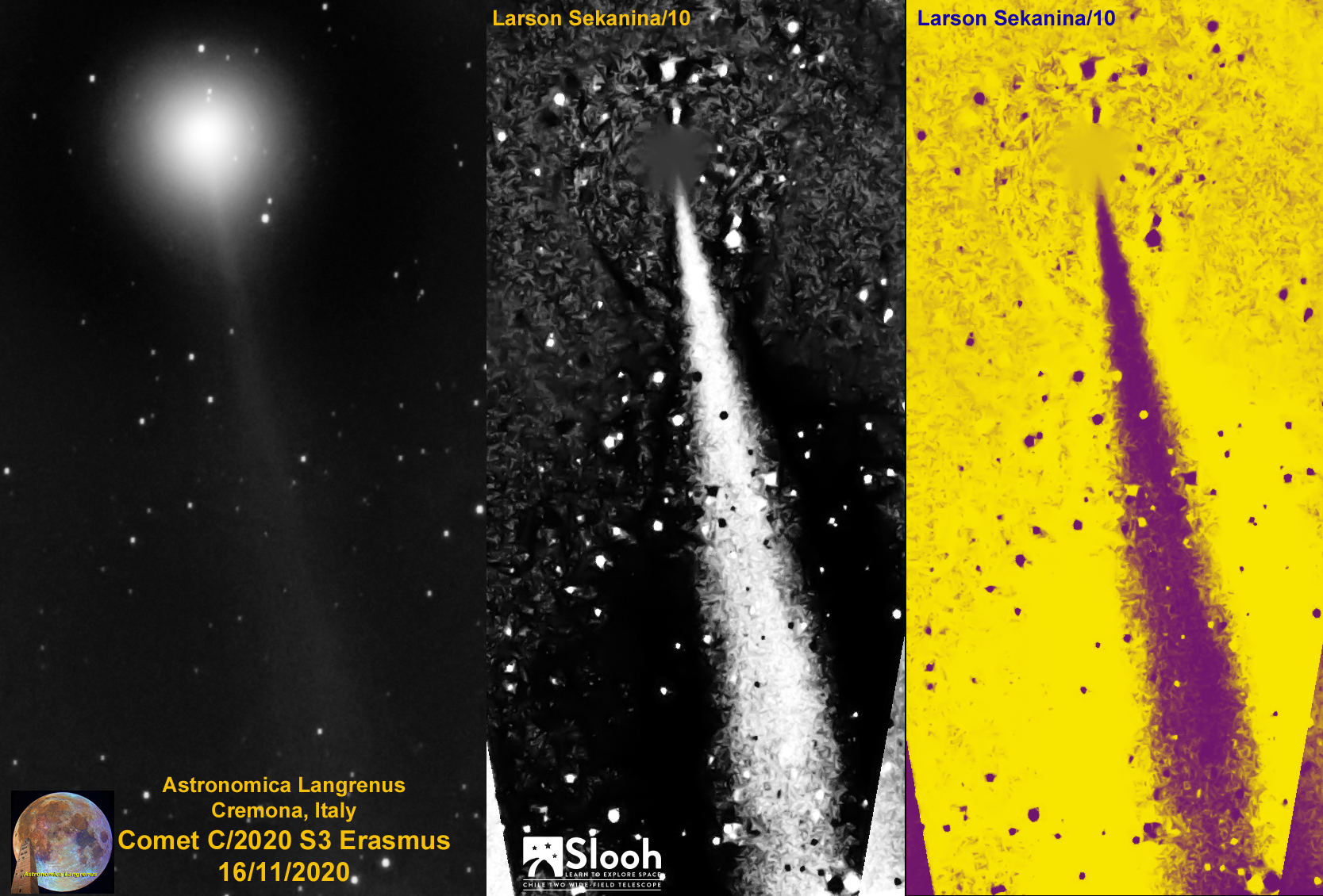 Cometa C/2020 S3 Erasmus il 16 Novembre 2020 ore 08:05UTC. Immagine da telescopio remoto (Cile) PW-CDK 17" 432mm F6,8. Magnitudine 7.3 nella costellazione del Corvo. Il 19 Novembre sarà a 1.038UA (minima distanza dalla Terra). A Dicembre dovrebbe raggiungere magnitudine 6. Cometa scoperta a Settembre 2020 dall’astronomo Nicolas Erasmus.