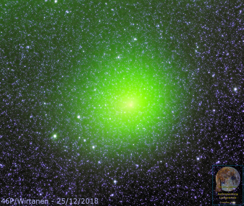Nell’ambito della "Campagna Osservativa del Progetto PACA 46P" un’altra immagine della Cometa 46P/Wirtanen ripresa il 25 Dicembre 2018 alle 03h10′ IT con telescopio a controllo remoto Petzval Rifrattore Apo 106mm F5 (Osservatorio Astronomico di May Hill, New Mexico, USA). Esposizioni: L 8×60" bin1 + RGB 1×60" bin2 ogni canale di colore.