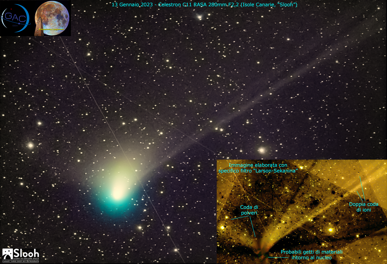 Cometa C/2022 E3 ZTF ripresa il 13 Gennaio 2023 dalle Isole Canarie con telescopio a controllo remoto della rete "Slohh" Celestron C11 RASA, 280mm F2,2. Viene inserita una elaborazione col filtro "Larson-Sekanina" in cui si evidenzia una presumibile attività espulsiva in prossimità del nucleo.
