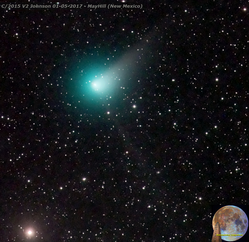 Cometa C/2015 V2 Johnson ripresa 01 Maggio 2017 alle ore IT 10:00 da MayHill (New Mexico) con telescopio remoto Astrografo APO Petzval 106mm F5 – Luminanza 9 x 60" bin1 + RGB 3 x 120" bin2. Si nota anche una seconda coda molto debole di ioni.