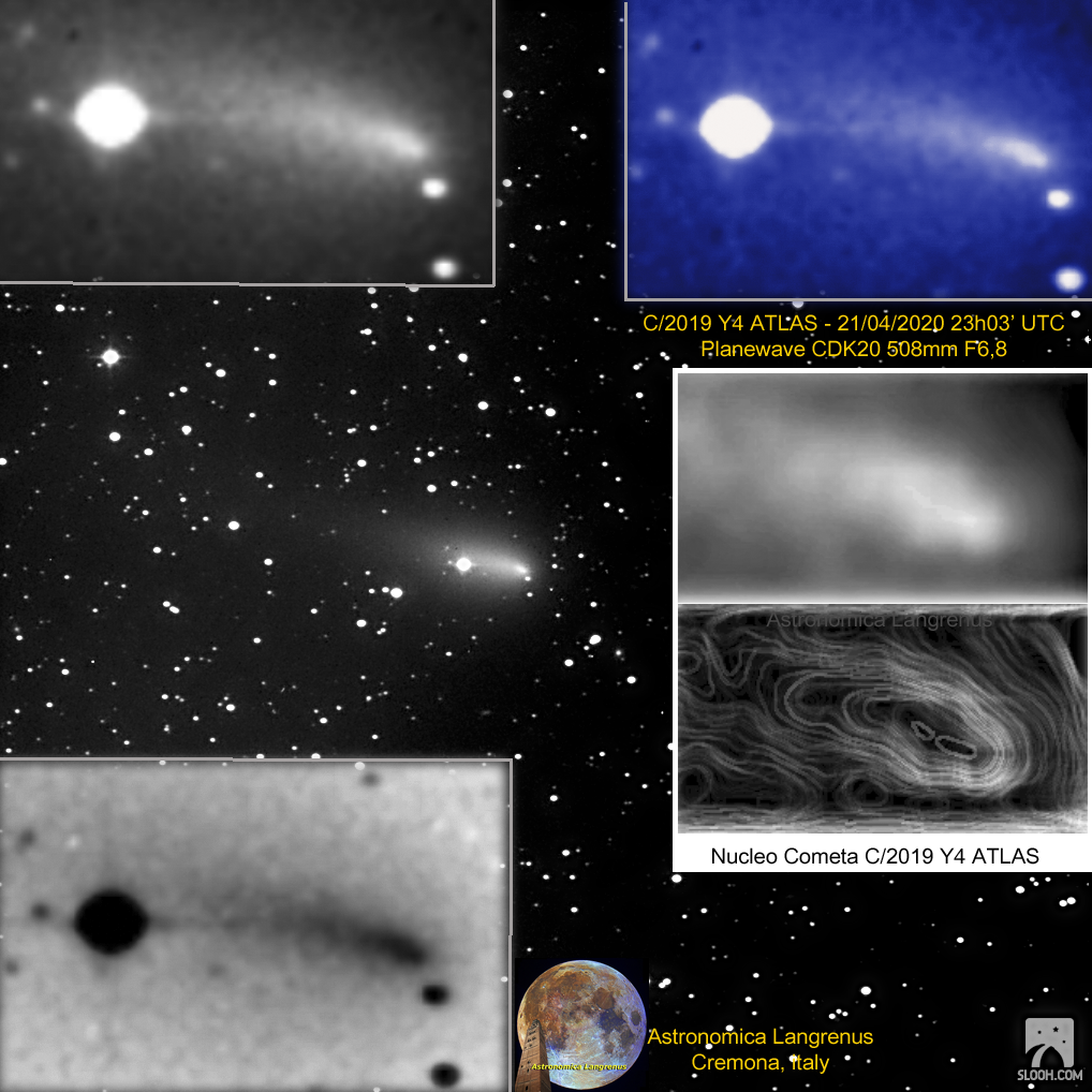 Cometa C/2019 Y4 Atlas ripresa il 21 Aprile 2020 alle 23h03′ UTC con telescopio a controllo remoto PW-CDK 20" f6,8 situato presso Osservatorio Astronomico Isole Canarie. Probabilmente si nota il nucleo ormai in fase di frammentazione.