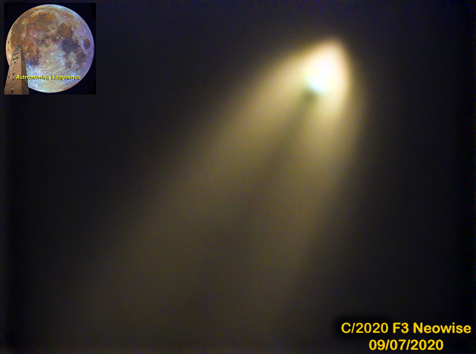 Per la Cometa "C/2020 F3 Neowise" è stato utilizzato il Mak Rumak 255mm f20 ridotto a f12,6 + ASI 224MC senza filtro. Media di 600 su 3800 frames a 30 fps in USB 2.0. Elaborazione Autostakkert, Registax, Photoshop.