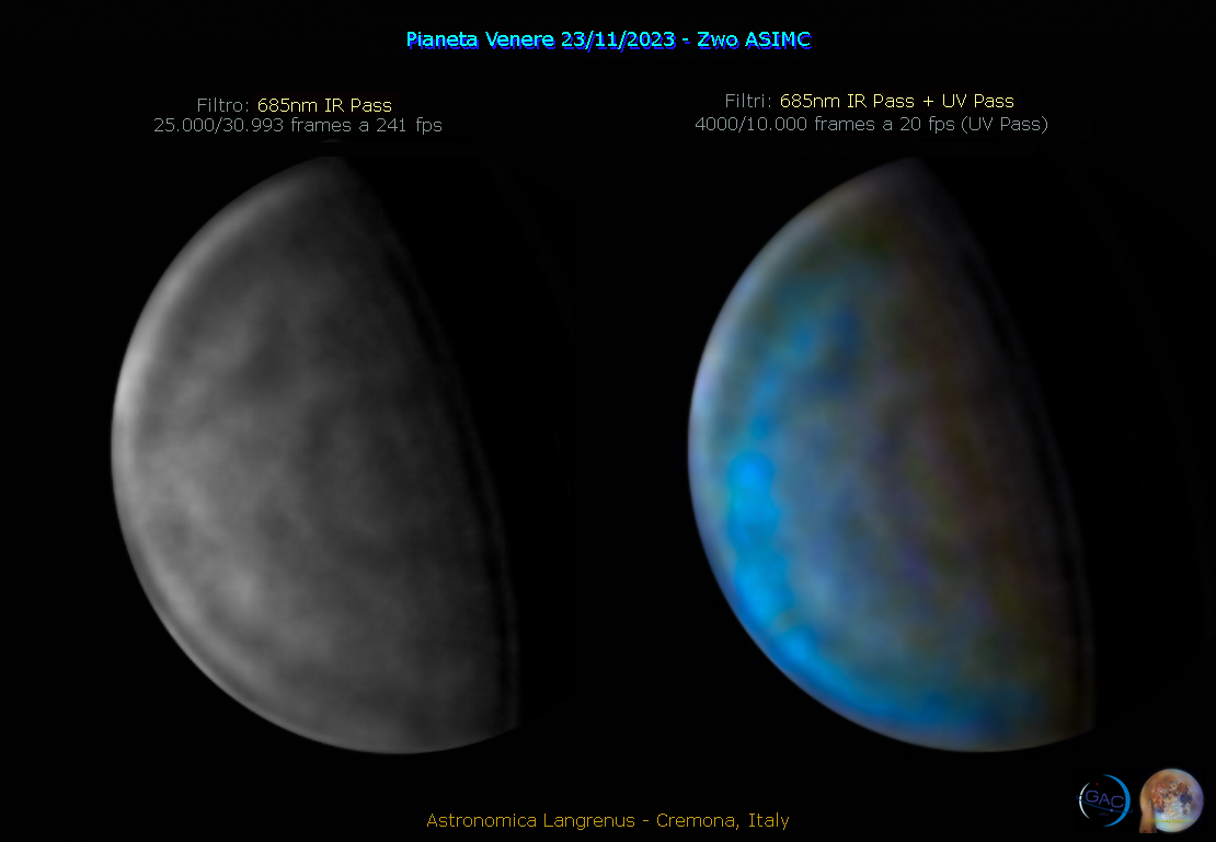 Immagini del pianeta Venere riprese il 23/11/2023 con telescopio Maksutov Rumak 255mm a F20, Zwo ASI 224MC, Correttore ADC. Filtri "685nm IR Pass" (25.000/30.993 frames a 241 fps) e "UV Pass" (4000/10.000 frames a 20 fps). Le immagini da IR Pass e UV sono state elaborate singolarmente e poi combinate fra loro.