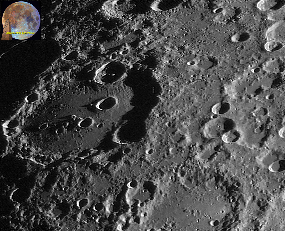 Altipiano meridionale della Luna col cratere Clavius (230 km). Telescopio Maksutov Rumak 255mm F20 + I.S. DBK41 1280×960. Esposizione 2’30" x 1/9" a 7,5 fps. Elaborazione Autostakkert 2.6.8, Registax.6, Photoshop.
