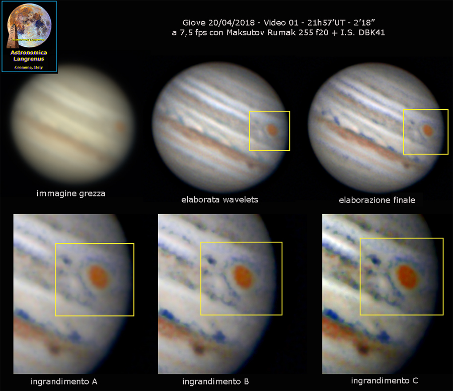 Rielaborazione di una pessima immagine di Giove acquisita il 20 Aprile 2018 alle 21h57’UT con telescopio Maksutov Rumak 255mm F20 + I.S. DBK41 con evidenziata, per quanto possibile, la struttura circolare in cui è inserita la "Grande Macchia Rossa". Immagine scadente (ma sempre utile…) causa turbolenza atmosferica.