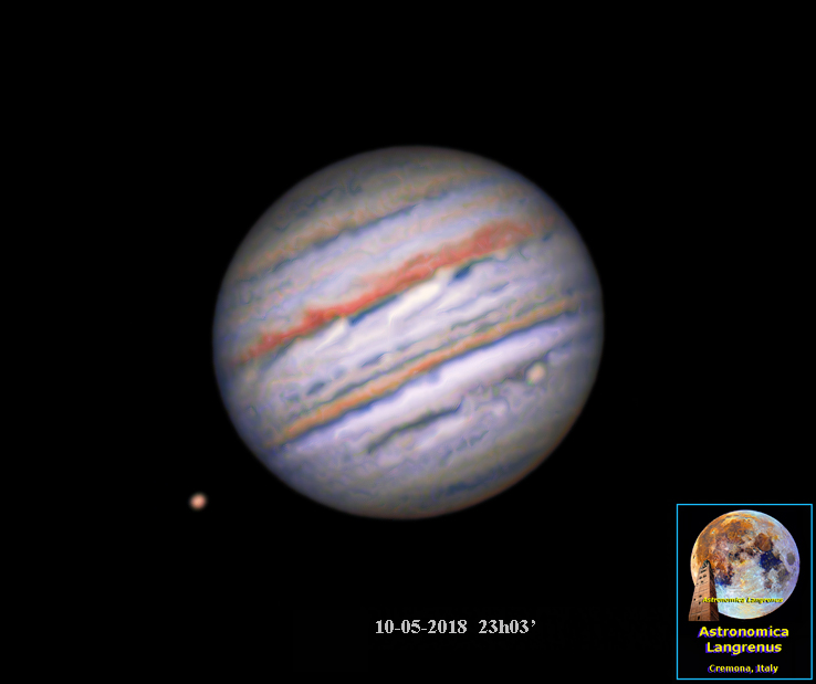 Giove in opposizione col satellite Jo. Immagine del 10 Maggio 2018 alle 23h03′ con telescopio Maksutov Rumak 255mm F20 + camera Imaging Source DBK41. Media di 700 su 1040 frames totali. Elaborazione Autostakkert, Registax, Photoshop. Purtroppo un’eccessiva e quasi permanente turbolenza ha condizionato la qualità delle immagini.
