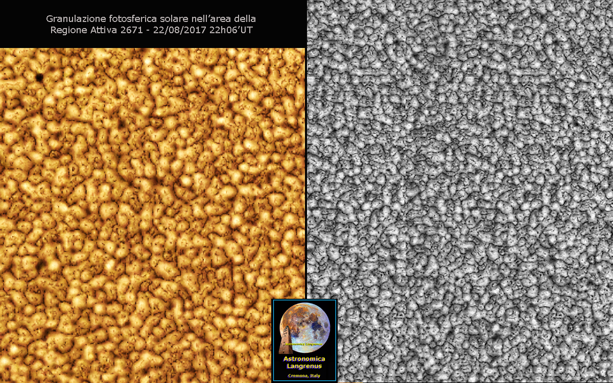 Granulazione fotosferica solare nell’area della Regione Solare Attiva 2671 dovuta alle correnti convettive di plasma che trapostano l’energia termica verso gli strati più esterni del Sole. Le dimensioni di ogni singolo granulo sono di circa 800/1000 km con una durata di non oltre i 20 minuti circa prima di dissiparsi. Immagini del 22/08/2017 06h22’38" UT con Mak Rumak 255mm F20 + I.S. DBK41 –