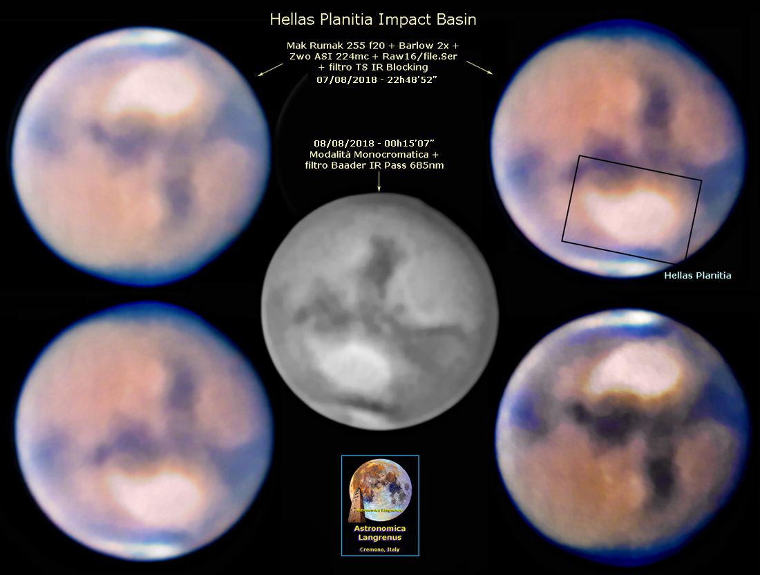 MARTE il 7 e 8 Agosto 2018 con evidenziata la notevole albedo del bacino da impatto Hellas Planitia rispetto alla restante superficie del pianeta. Da varie fonti tale luminosità sarebbe dovuta alla quantità di polveri in sospensione a causa dei forti venti che spirano in quella regione marziana. Nessuno mette in dubbio tale affermazione ma vi sono alcune considerazioni da fare guardando le immagini: