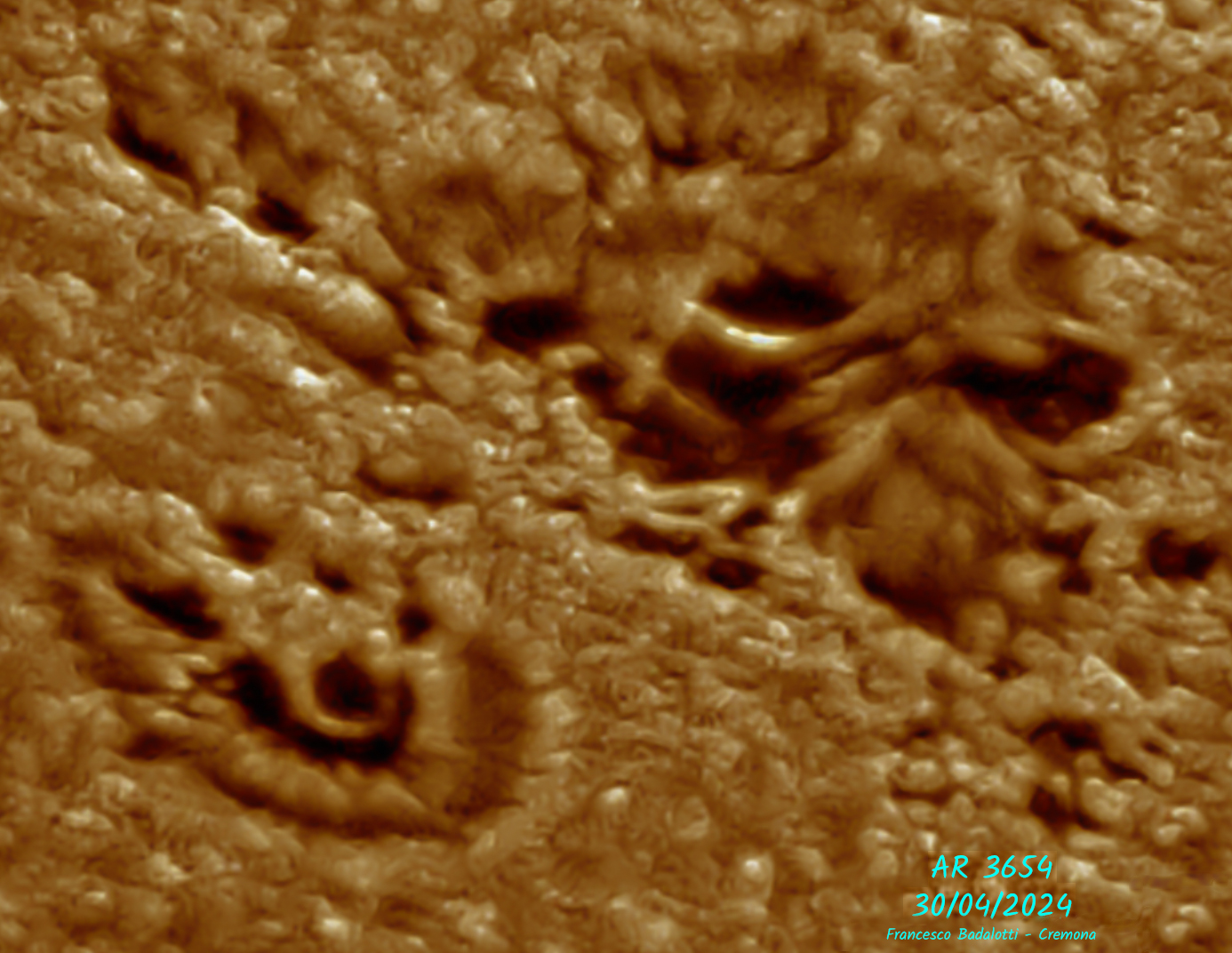Il Sole il 30 Aprile 2024 con una parte del gruppo di macchie della regione solare attiva “AR 3654”. Telescopio Maksutov Rumak 255mm f20 utilizzato a varie focali, filtro a tutta apertura Astrosolar ASTF/280, filtro UV-IR block, camera Cmos Zwo ASI 482MC. Acquisizione video con AsiStudio, elaborazione video e stacking con Autostakkert, elaborazione immagini Astrosurface, Fitswork, Camera Raw, Photoshop. Formato video “Raw8.AVI”, media di 500/5000-6000 frames totali a 90 fps