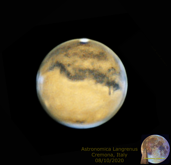 Marte 08 Ottobre 2020 alle 23:40. Telescopio Maksutov Rumak 255 F20 + Barlow 2x + Zwo ASI 224MC + filtro IR Blocking. 30 fps in USB 2.0. Si nota il disco del pianeta attraversato dalle scure aree dei mari Sirenum e Cimmerium con lo stretto Gomer Sinus, oltre a varie formazioni nuvolose di colore chiaro sui bordi est/ovest e l’imponente mole di Olympus Mons.