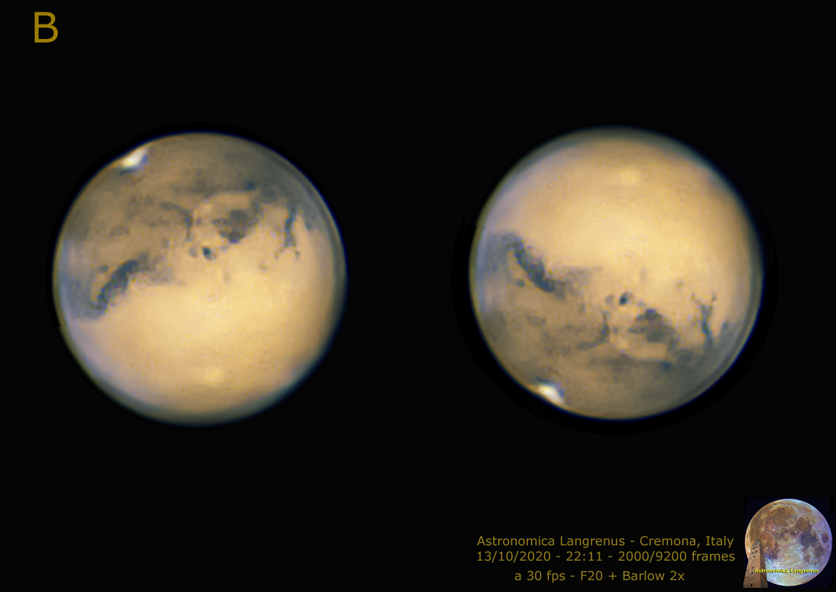 Pianeta MARTE il 13 Ottobre 2020. Telescopio Maksutov Rumak 255mm F20 + Barlow 2x + Zwo ASI 224MC + filtro IR Blocking. Media di 2000/9200 frames totali a 30 fps in USB2.0. No derotazione.
