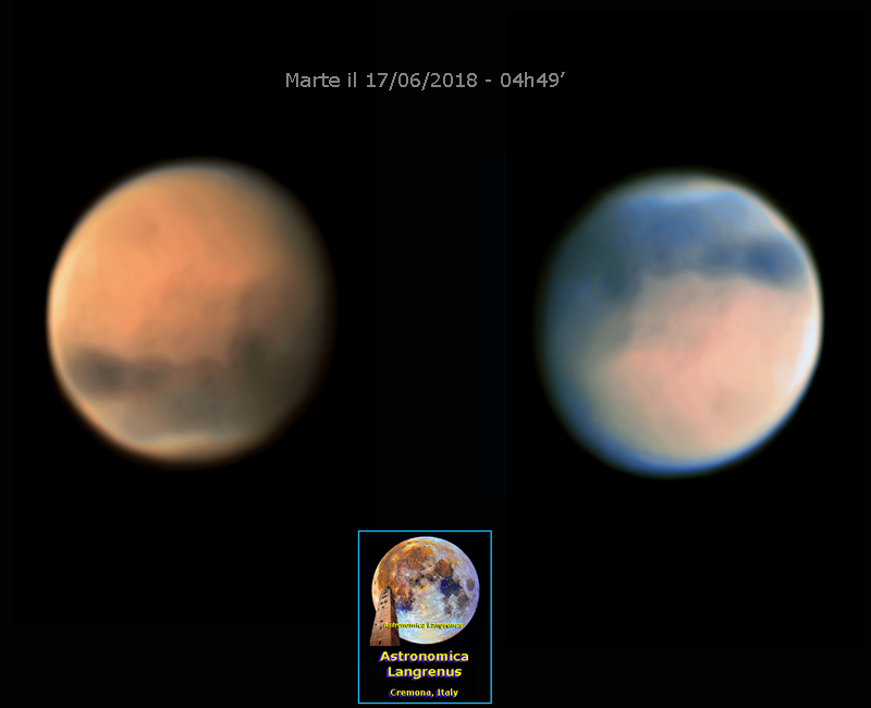 Marte acquisito il 17 Giugno 2018 alle 04h49′. Telescopio Mak Rumak 255 f20 + barlow 2x, focale di acquisizione 10.000 mm (f40). Camera I.S. DBK41. Immagine qualitativamente scadente, viene pubblicata esclusivamente come documentazione. La visibilità dei dettagli è condizionata dalla notevole turbolenza atmosferica e dalla tempesta di sabbia estesa su un’area di 35 milioni di kmq.