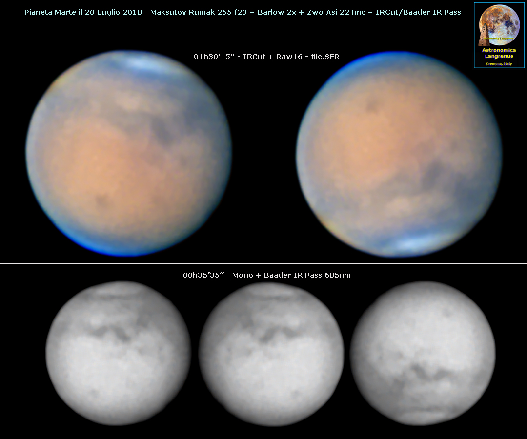 MARTE la notte del 20 Luglio 2018 con telescopio Maksutov Rumak 255mm f20 + Barlow 2x (f40, focale 10.000mm) + camera Zwo Asi 224mc con filtro IRCut in modalità "Raw16-file.SER" oppure con filtro IR Pass 685nm in modalità "Mono". La piccola macchia scura isolata è il monte Olympus.
