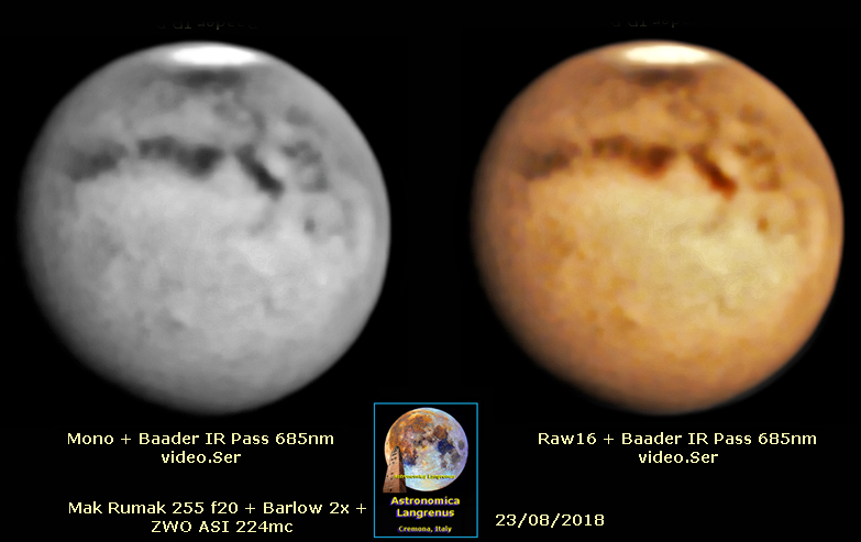 Questo è MARTE la sera del 23 Agosto 2018 ripreso con telescopio Mak Rumak 255mm f20 + Barlow 2x + ZWO ASI 224mc nelle modalità Monocromatica e Raw16, utilizzando in entrambi i casi il filtro Baader IR Pass 685nm. Software di acquisizione video SharpCap. Elaborazione video con Autostakkert, elaborazione immagini con Registax, Photoshop, MaxIm, Piccure. La camera ZWO ASI 224mc è USB3.0 ma viene fatta lavorare in un computer USB2.0.
