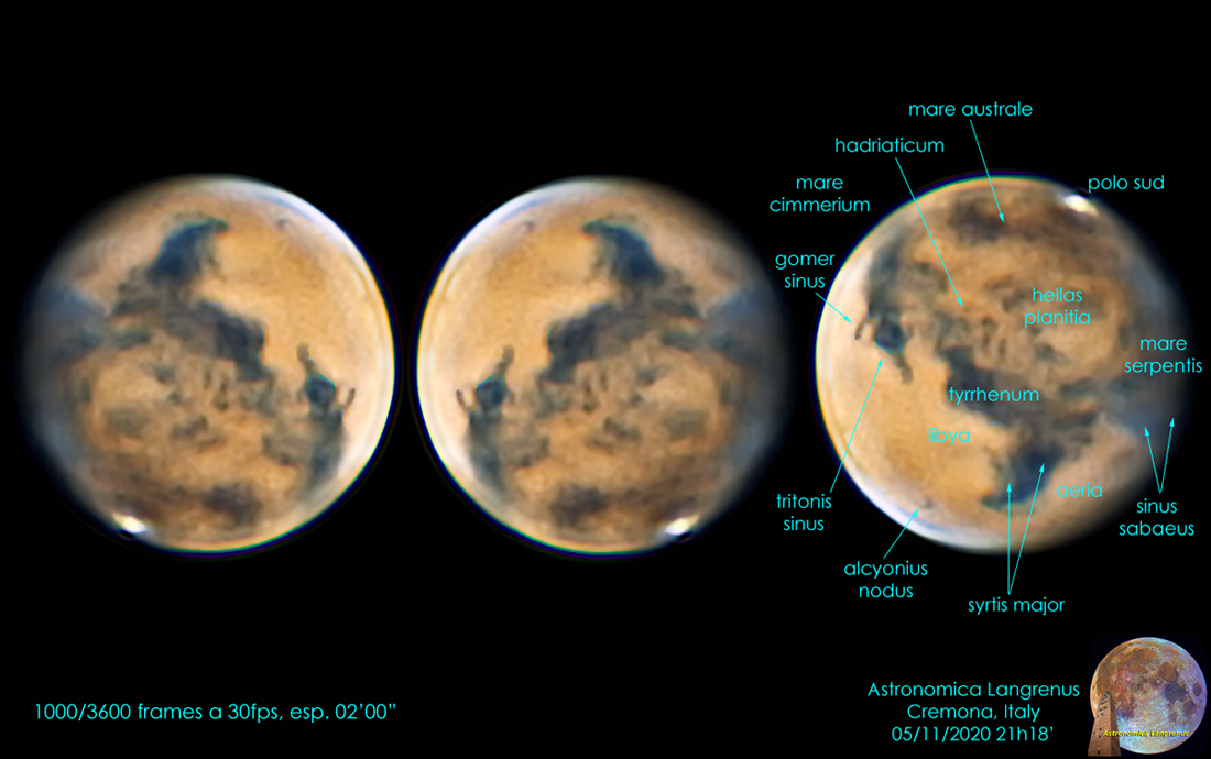 Marte la sera del 5 Novembre 2020. Telescopio Mak Rumak 255 F20 + Barlow 2x + filtro IR Blocking + ASI 224MC. Acquisizione a 71 e 30 fps. Elaborazione Autostakkert, Registax, Fitswork, Piccure, Camera Raw.