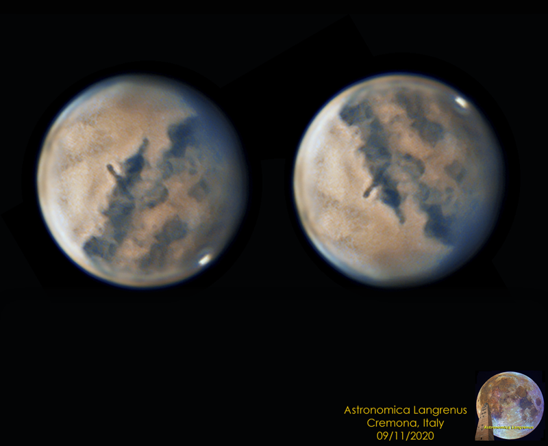 Pianeta Marte il 9 Novembre 2020. Maksutov Rumak 255 f20 + Barlow 2x + filtro IR Blocking + Zwo ASI 224MC. Media di 800/3300 frames a 27fps, esposizione 02’00".