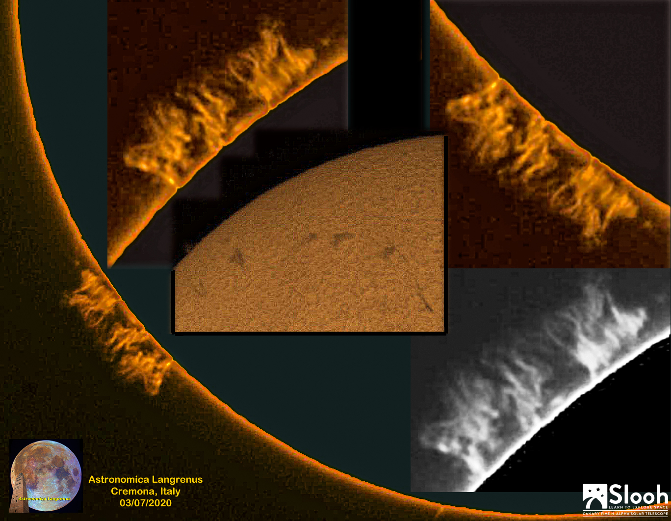Il Sole con le sue protuberanze ripreso il 03 Luglio 2020 col telescopio solare a controllo remoto situato alle Isole Canarie (Slooh). Lunt H-Alpha 60mm f8,3. File FITS elaborati in MaxIm DL e Photoshop.
