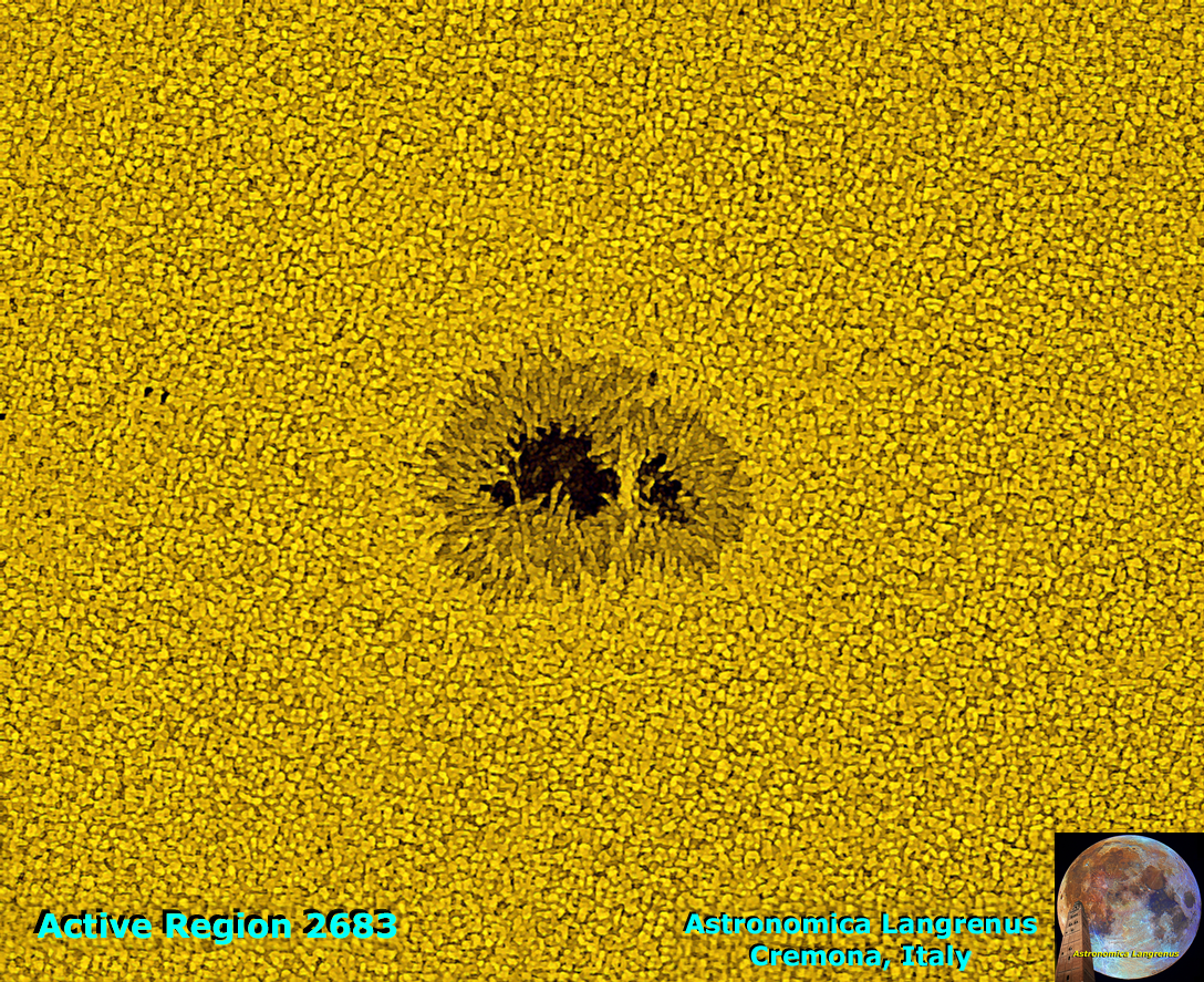 Regione solare attiva AR 2683. Immagine del 30 Settembre 2017 con telescopio Maksutov Rumak 255mm F20 ridotto a F12 + filtro Baader Planetarium Astrosolar ASTF280 + filtro interferenziale Continuum CWL 540nm.