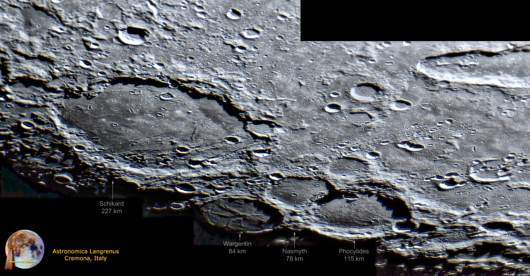 Questo bel quartetto di crateri si trova nel settore sudoccidentale della Luna. Riprese del 5 Aprile 2020 con telescopio Maksutov Rumak 255mm F20 + Zwo ASI 224MC + filtro TS IR Blocking. Media di 500/3000 frames a 28 fps in USB2.0. Elaborazione Autostakkert, Wavelet di Registax, Camera Raw.