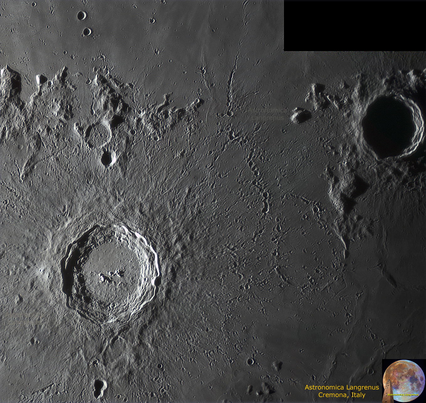 La regione fra i crateri Copernicus ed Eratosthenes lungo il margine meridionale del mare Imbrium con una parte dei monti Carpathus. La spettacolare ed imponente mole del cratere Copernicus con le sue pareti percorse da lunghi terrazzamenti è ancora illuminata dalla luce solare, in contrasto col cratere Eratosthenes che sta entrando nella lunga notte lunare. Fra questi si vede Stadius, cratere fantasma di 60 km. Mak Rumak 255 F20 + Zwo ASI 224MC + filtro IR Blocking.