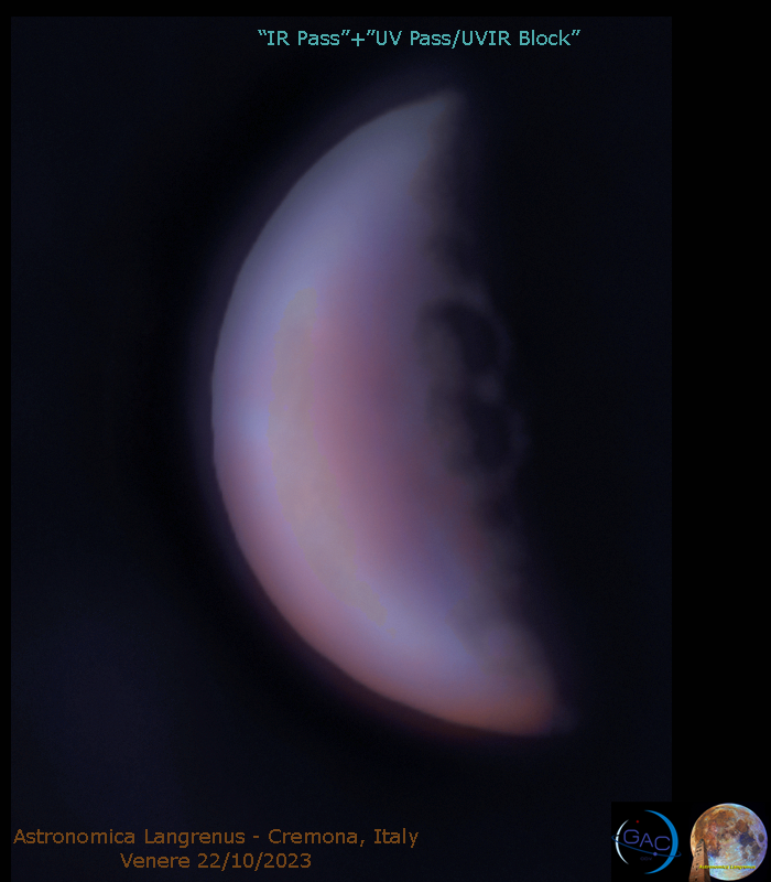 Telescopio Maksutov Rumak 255mm a F20, Zwo ASI 224MC, filtro 685nm IR Pass, UV Pass sovrapposto a UVIR Pass. Correttore Omegon ADC. E’ stato acquisito un video col filtro 685nm IR Pass. Un altro video è stato acquisito abbinando entrambi i filtri UV Pass e IRUV Block. Infine le rispettive immagini sono state fuse tra loro ed elaborate fino ad ottenere l’immagine finale.