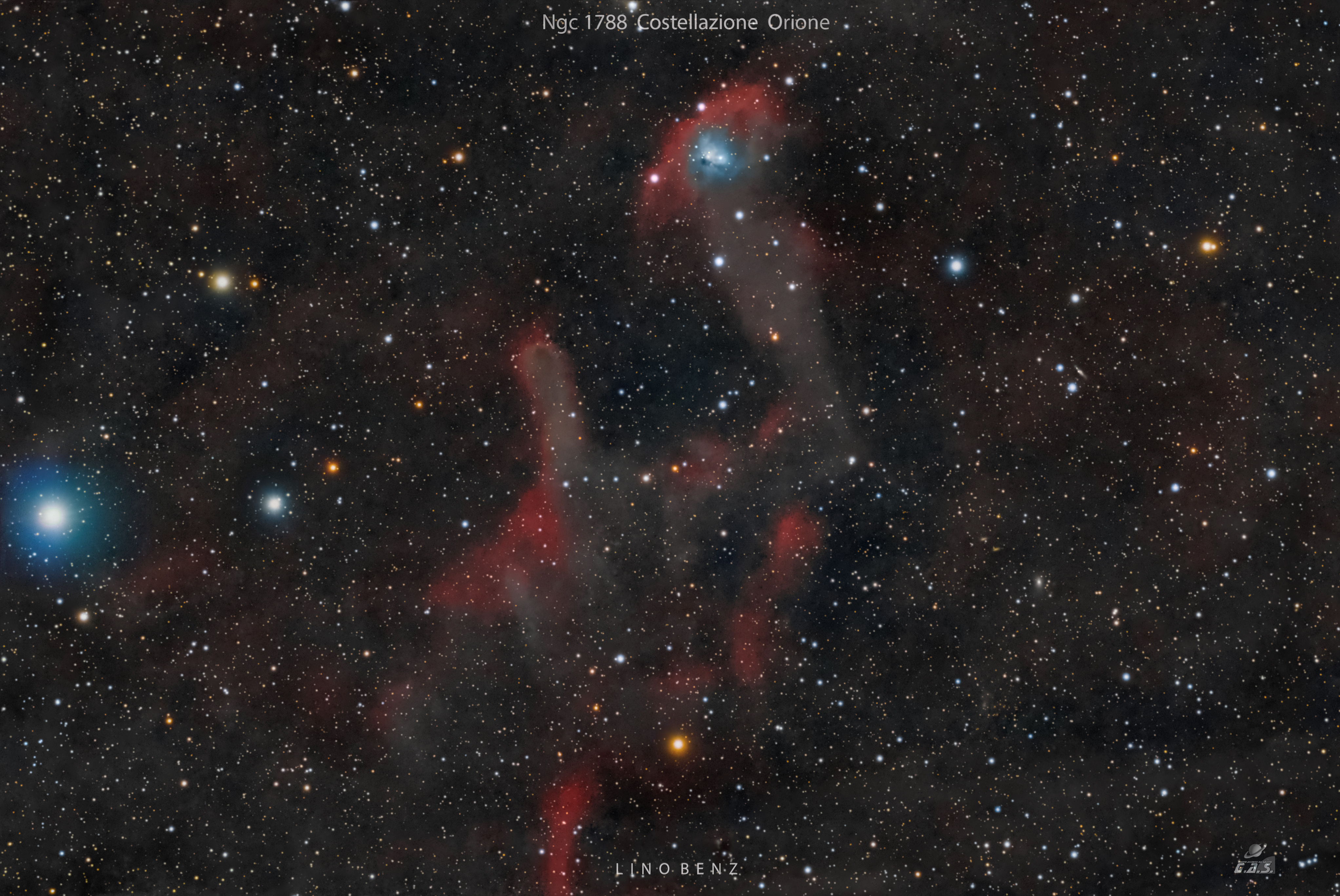 NGC 1788 è una nebulosa diffusa osservabile nella costellazione di Orione. Si individua circa 2 gradi a nord della stella β Eridani, nella parte occidentale della costellazione; ha delle dimensioni relativamente ridotte e può essere osservata con un potente telescopio o nelle foto a lunga posa. La nebulosa riflette la luce delle stelle vicine, in particolare di un astro di decima magnitudine, situata nel settore nordoccidentale della nebulosa. Verso sud, NGC 1788 è attraversata da una banda oscura, nota come LDN 1616; la distanza del complesso nebuloso è stimata sui 1470 anni luce da noi. Ripresa in due serate , una con luna al 50% prossimo anno si integra light da 300" tot. 6h filtro Optolong L-Quad Enhance 2" tele SW Evostar 72 ed ridotto 0.8x Cam Qhy294c pro , guida phd2 mon. Eq6r pro software di acquisizione N.I.N.A. stacking DSS , elab. PixInsight + Photoshop.