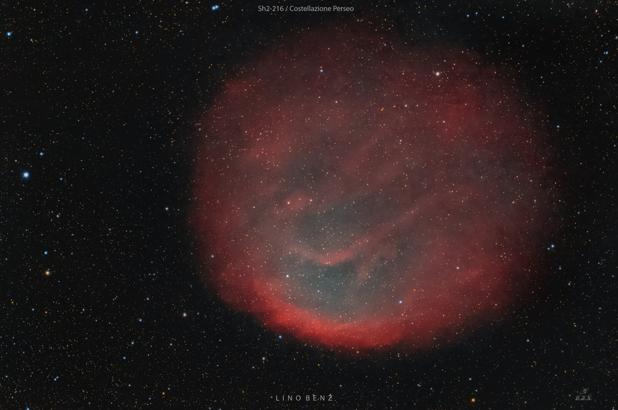Sh2-216 è una nebulosa planetaria visibile nella costellazione di Perseo. Si individua nella parte più orientale della costellazione, circa 5° ad ovest della brillante Capella. Soggetto molto debole anche in fotografia, dista circa 420 anni luce è la nebulosa planetaria più vicina in assoluto al sistema solare, la grande dispersione dei suoi gas, che la rende anche la più grande planetaria osservabile nella volta celeste, è dovuta alla grande età della nube, stimata attorno ai 600.000 anni , questo è il risultato di 10h e 55 minuti con circa 2h dello scorso anno. SW Evostar 72ed ridotto a 335 Cam Qhy 294c pro guida phd2 su SW Eq6r pro, light 131 da 300" con filtro L-Ultimate 2" più 31 da 60" con filtro L-QEF software di acquisizione N.I.N.A. somma DSS elab PixInsight Photoshop