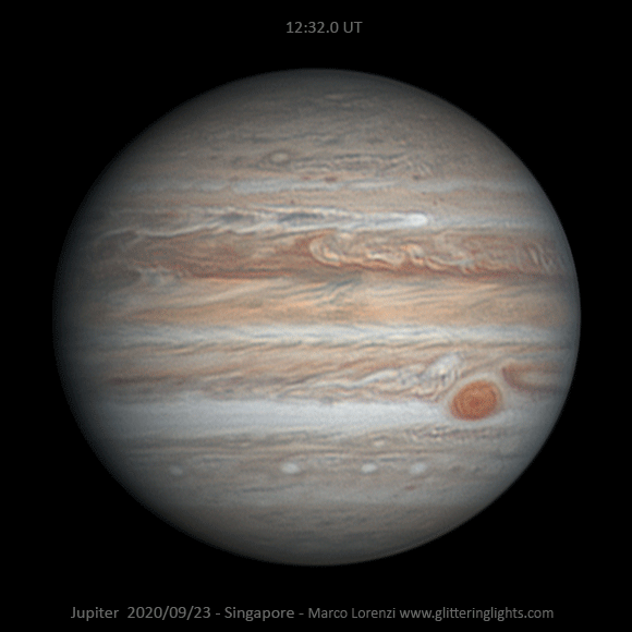 1 ora e mezza di rotazione di Giove in quattro sequenze montate a generare una animazione. L’effetto dell’intensa attività sul pianeta durante le settimane precedenti (tre outbreak in pochi giorni!) e’ chiaramente visibile su tutto l’emisfero nord di Giove, con le varie bande frastagliate a causa dalle perturbazioni in corso ..