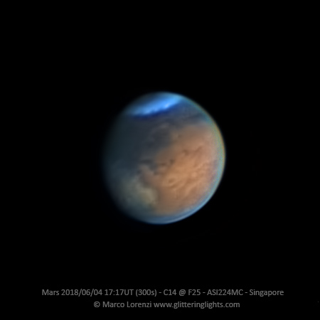 Condizioni di seeing medio, pianeta a circa 30 gradi di elevazione. Diametro alla ripresa =15.9". 20.000 fotogrammi mediati da una ripresa di 5 minuti con ASI-224MC. In basso a sinistra si vede l’inizio della tempesta di sabbia che sta coprendo la superficie del pianeta questi giorni.
