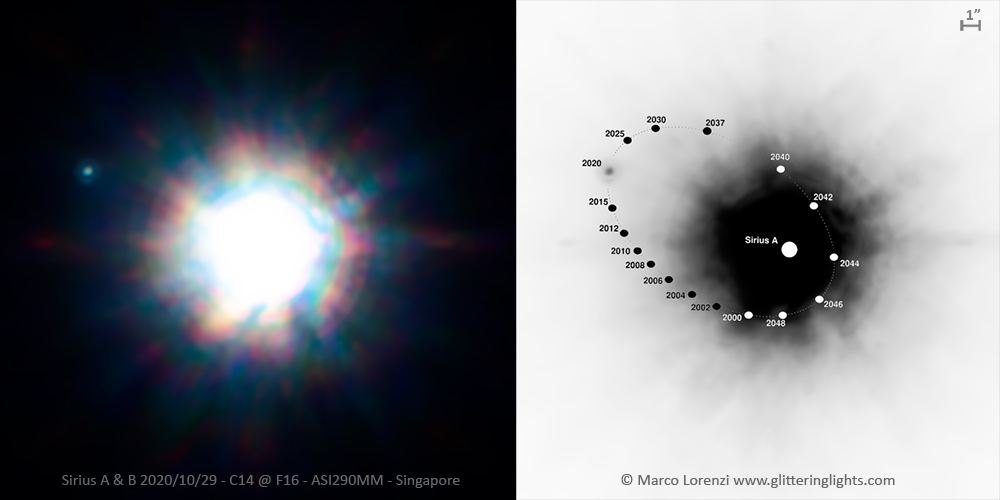 La doppia piu’ brillante del cielo, Sirio A e la compagna Sirio B hanno quasi raggiunto la massima separazione (11") nella loro orbita di 50 anni, che ne rende piu’ facile l’osservazione al telescopio, anche se la differenza di luminosita’ di 9000 volte non facilita la vita 🙂