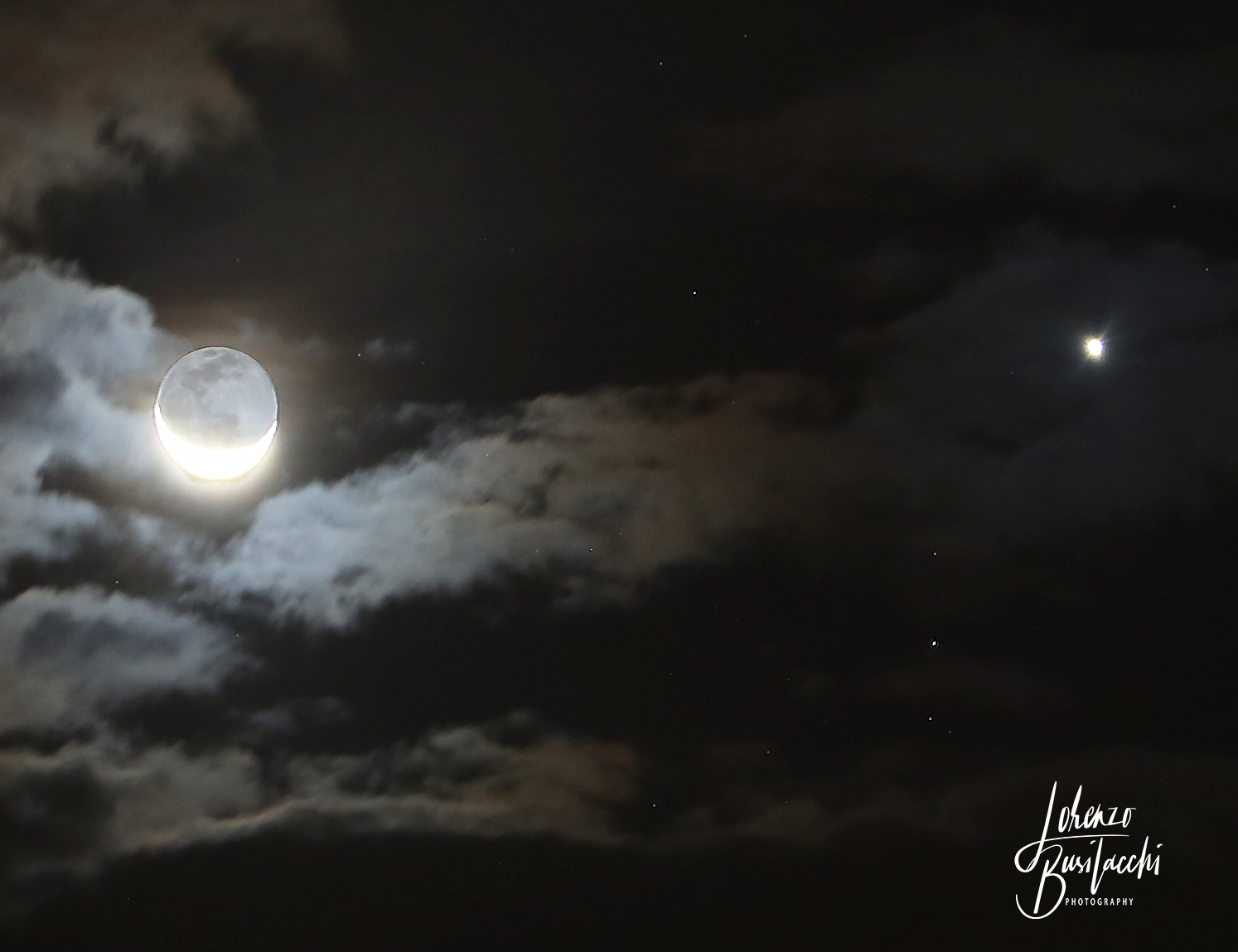 Bellissima congiunzione tra la Luna illumnata(lben evidente la luce cinerea) al 9% e Venere, ripresa tormentata da leggera pioggerellina e nuvole diffuse.