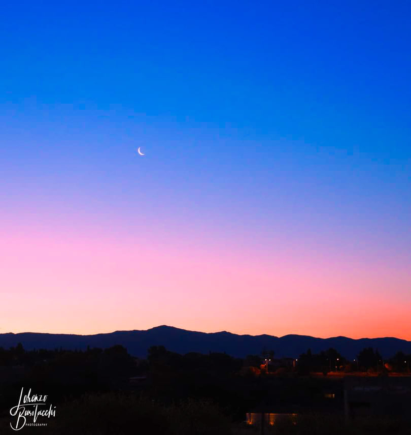 Al mattino bellissima falce di Luna sopra i monti, con un alba dai colori vari ed armoniosi.