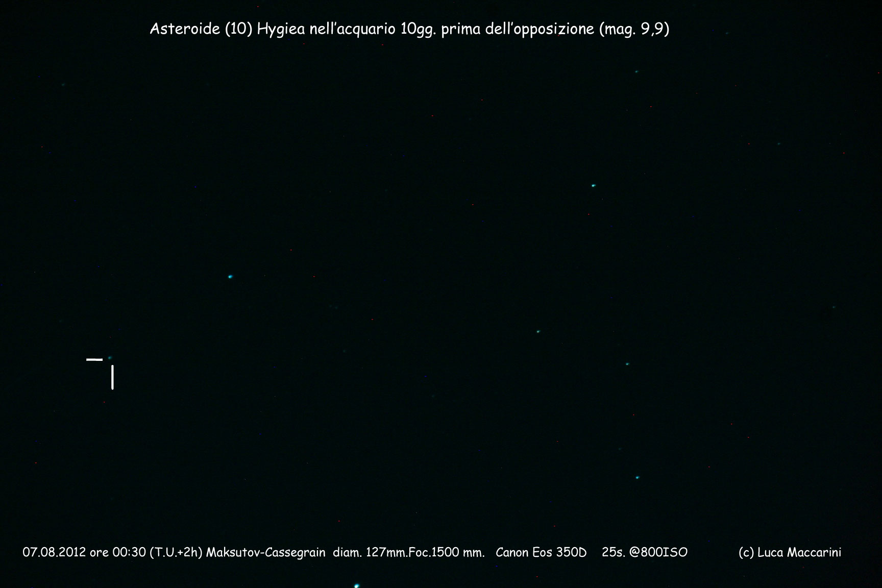 L’asteroide (10) Hygiea di 9,9 mag. nella costellazione dell’Acquario ripreso 10gg. prima dell’opposizione. La foto e’ stata scattata con una DSLR Canon Eos 350D, singola posa di 25sec.@800 ISO, su montatura altazimutale (non guidata). Nessuna elaborazione (no dark, no flat). L’ immagine non e’ esteticamente bella, ma ho voluto tentare la ripresa, con una strumentazione minimale, di un oggetto di 10a magnitudine, a bassa declinazione (RA 22h 09m DEC -07° 17′) ed immerso nella foschia e nelle luci diffuse di un sito suburbano.