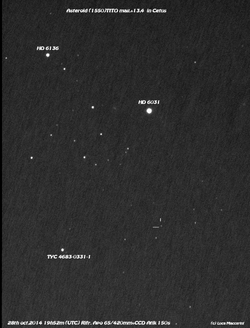 Seconda ripresa dell’asteroide (1550)TITO di mag.+13,4 nella Balena. A distanza della prima ripresa, dopo circa 40minuti, il movimento del pianetino e’ appena percettibile. Da notare, come in alto vicino alla stella HD 6031 siano appena visibili NGC349 e NGC350 .Somma di 5 scatti da 25s (+3 flat+1dark). Elaborazione digitale e riduzione astrometrica Astroart4.0