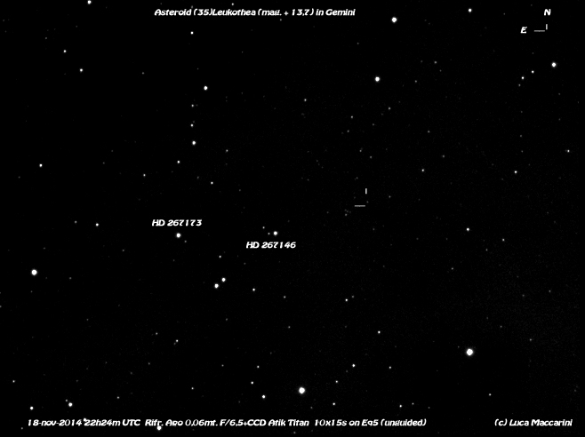 Ripresa dell’asteroide (35)Leukothea di mag. +13,7 (dimensioni 51,6 Km) nella costellazione dei Gemelli immerso in un campo stellare delle dimensioni angolari di 39,4’x29,5′
