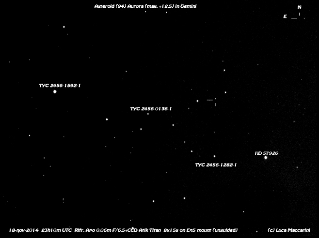 Seconda immagine dell’asteroide (94)Aurora di mag. +12,5 (dimensioni 102,4 Km) nella costellazione dei Gemelli immerso in un campo stellare dalle dimensioni angolari di 39,4′x29,5′
