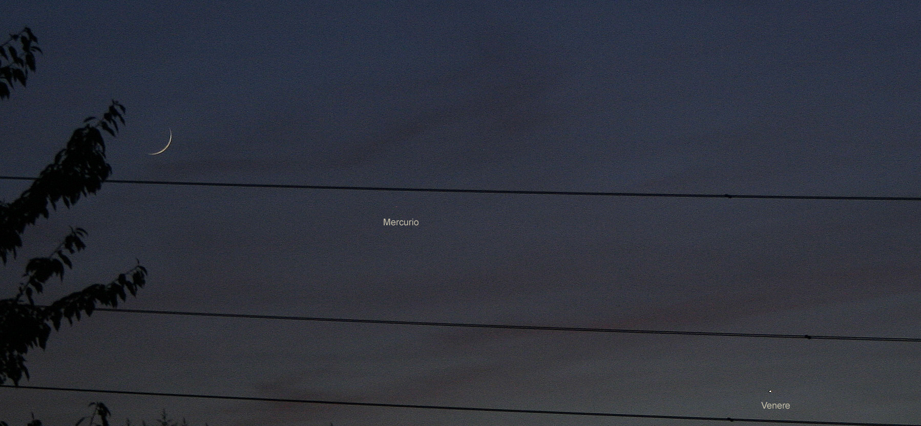 Congiunzione a nord-ovest di Luna-Mercurio-Venere ripresa da un cielo suburbano. Venere ad una altezza di 7° gradi e Mercurio visibile a 10° gradi sopra l’orizzonte.