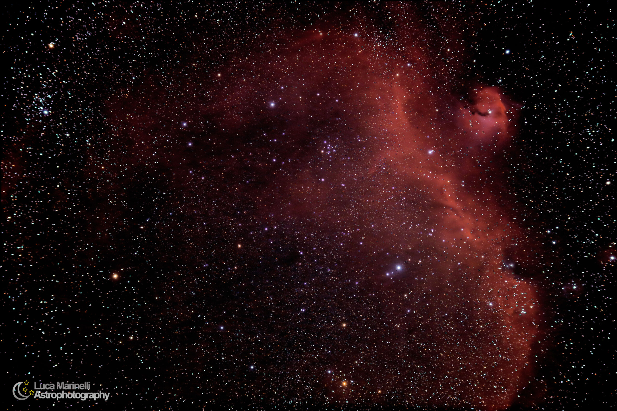 Telescopio rifrattore Skywatcher 80ED apocromatico, montato su AZEQ6, telescopio guida rifrattore Skywatcher 102/500, autoguida Lacerta, fotocamera: Reflex Digitale Canon 6DMKII modificata, Filtro IDAS LPS D1.