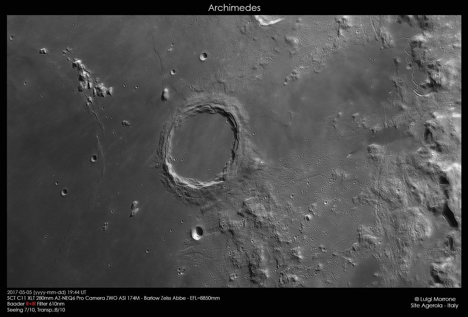 Ripresa del cratere lunare Archimede con C11 XLT 280mm e camera ASI monocromatica 174M.