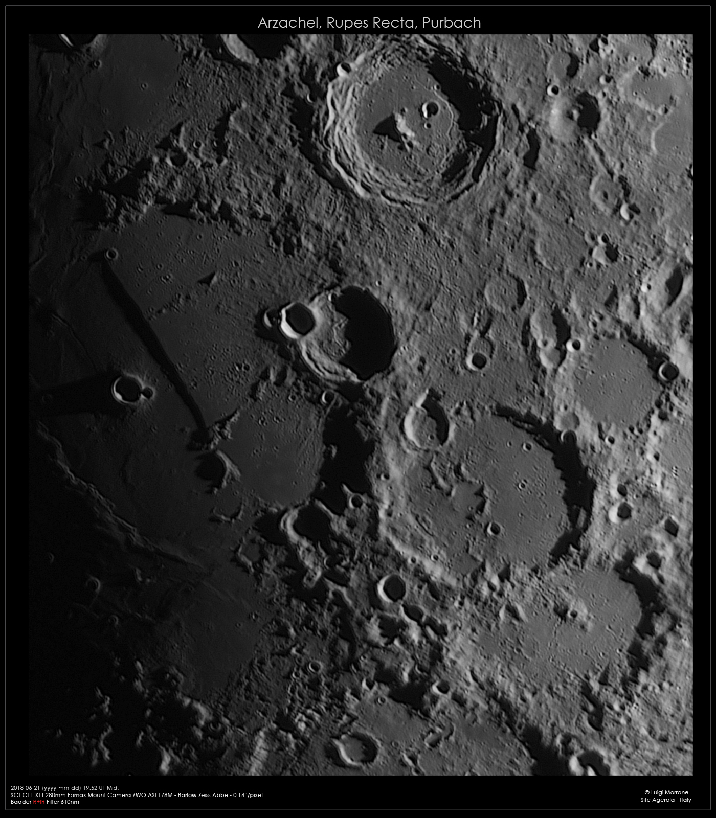 Arzachel, Rupes Rect e Purbach ripresi in condizioni a tratti buone.