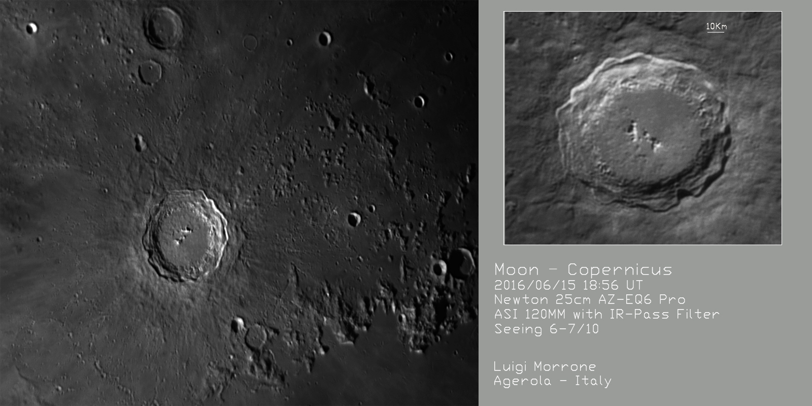 Copernicus è uno dei più appariscenti crateri lunari. Ha un diametro di 93 km e un dislivello fondo/cinta che arriva a 3,7 km, mentre rispetto alla superficie esterna l’altezza delle pareti è di 900 m. In fase di plenilunio, Copernicus è molto illuminato e si presenta circondato da una raggiera luminosa.