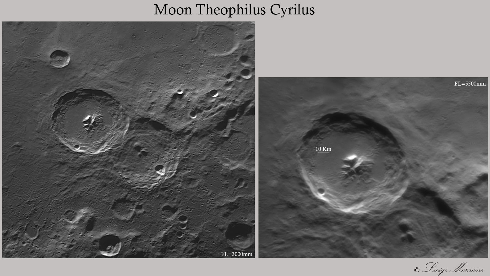 Theophilus è uno dei crateri più belli ed imponenti posto tra il Mare Nectaris e il Sinus Asperitatis.Ha un diametro di 100 Km e pareti terrazzate che si elevano fino a 4400 m dal fondo. Al centro è situata un’imponente catena montuosa.
