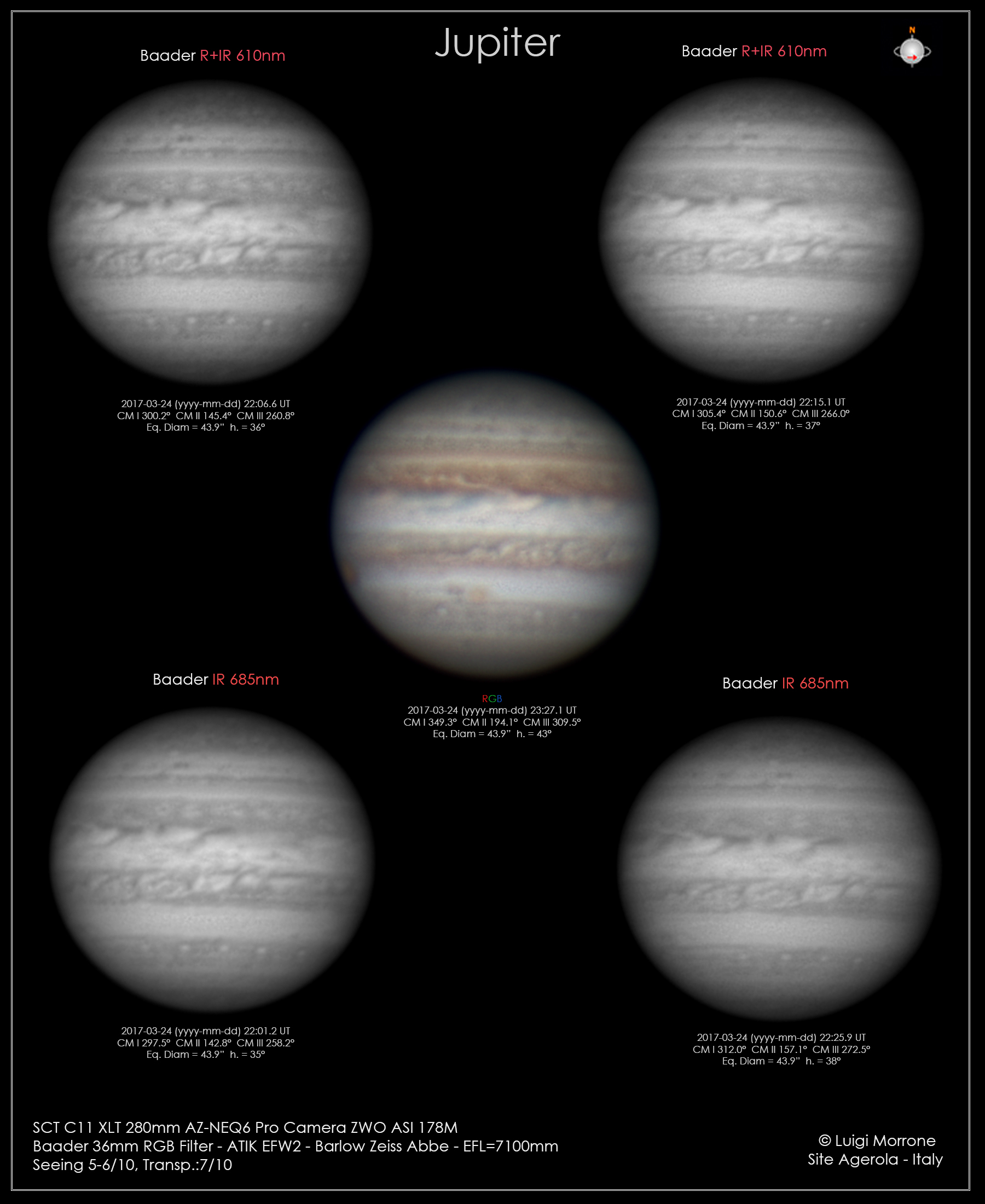 Ripresa di Giove del 24 marzo 2017. Condizioni meteo caratterizzate da buona trasparenza, ma purtroppo da anche dai jet stream. L’acquisizione in RGB mostra la GRS che sta sorgendo sul lato sinistro e l’ovale BA al CM.