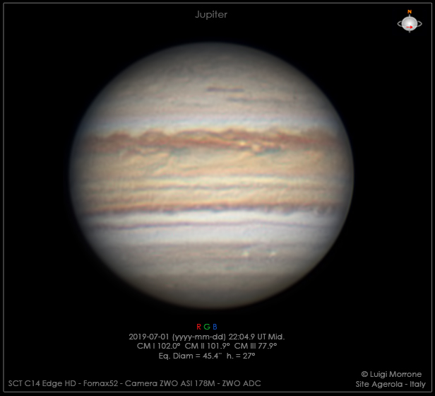 Sessione effettuata in RGB con buone condizioni atmosferica, considerando la posizione del gigante gassoso: circa 26° sopra l’orizzonte.